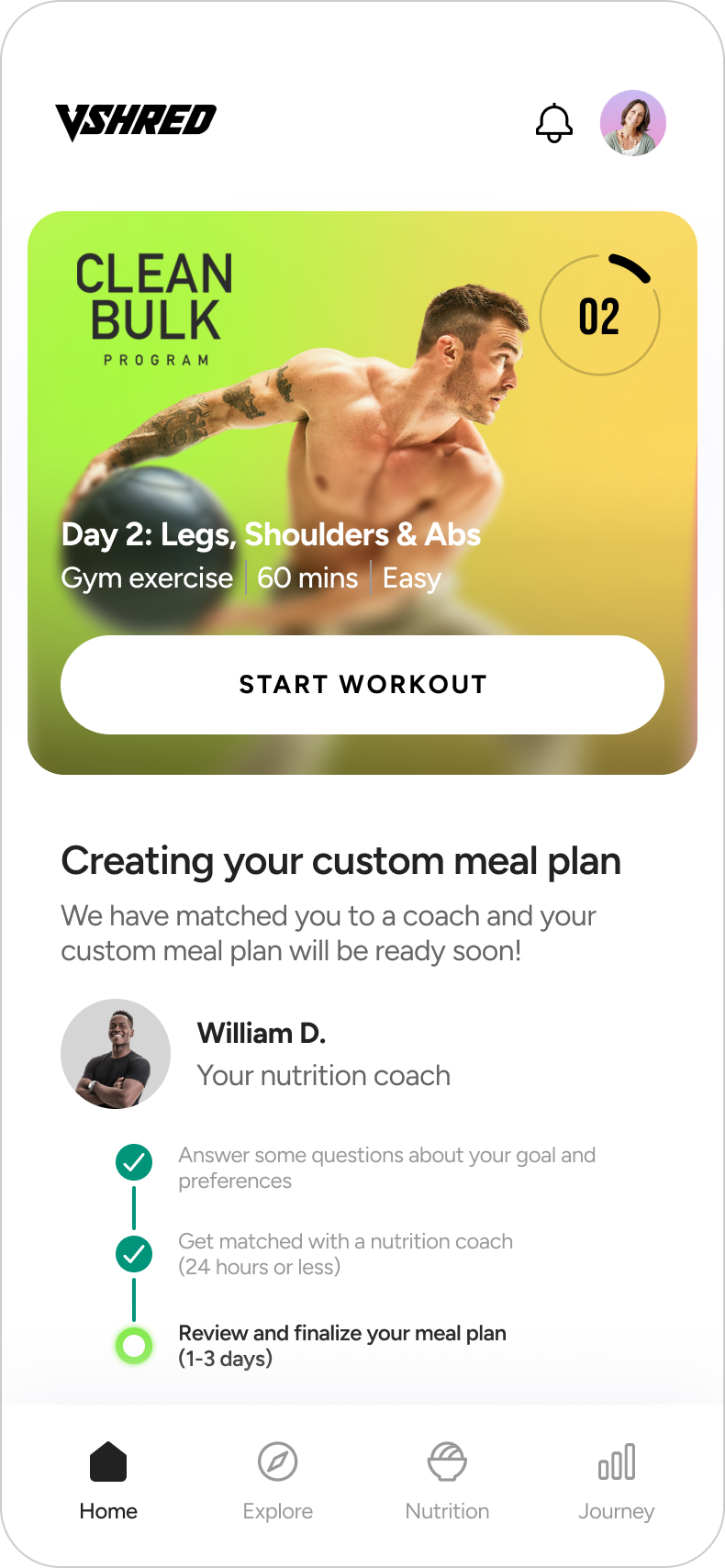 V Shred offers a custom meal plan subscription, where users answer a series of questions about their goals and eating preferences, a nutritionist ‘coach’ sets up a daily meal plan, and then the user and the coach can adjust the plan as needed.