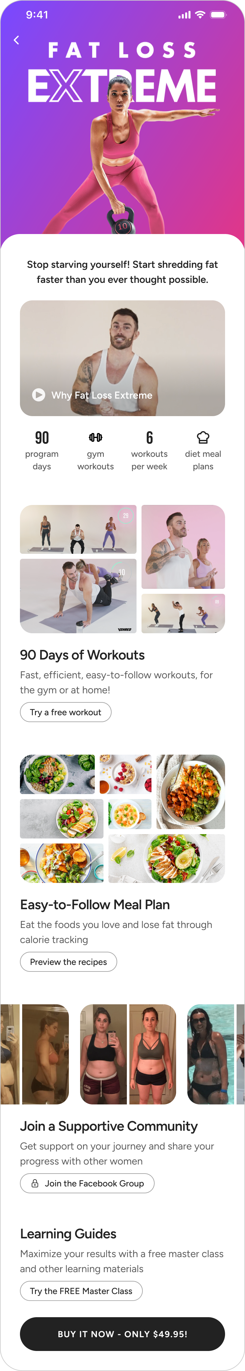 In user testing, community support and showing program results also built trust in the program, so we included links to the Facebook group, with before and after photos.