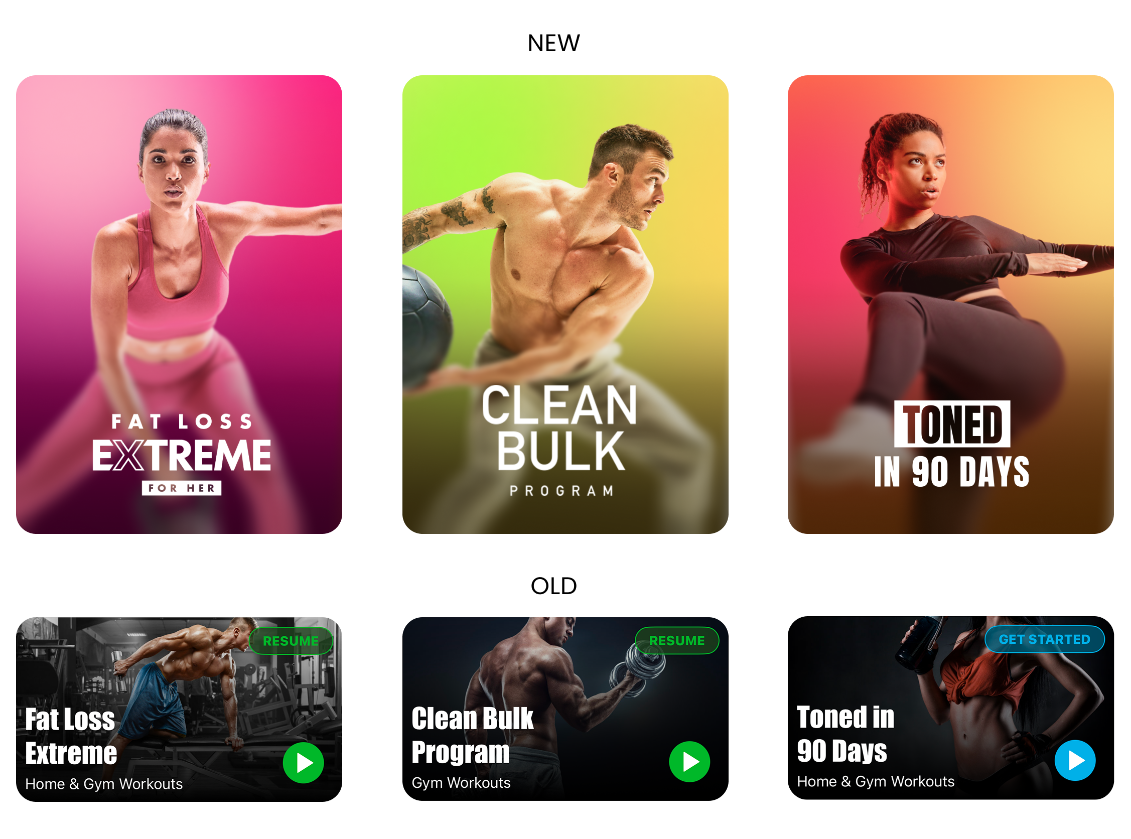 One area of the app that reflected this new aesthetic was the new fitness program branding. We replaced dark, brooding visuals and overly muscular trainer photos with bright colors, trainers with more relatable physiques, and with dynamic poses (see the comparison below).